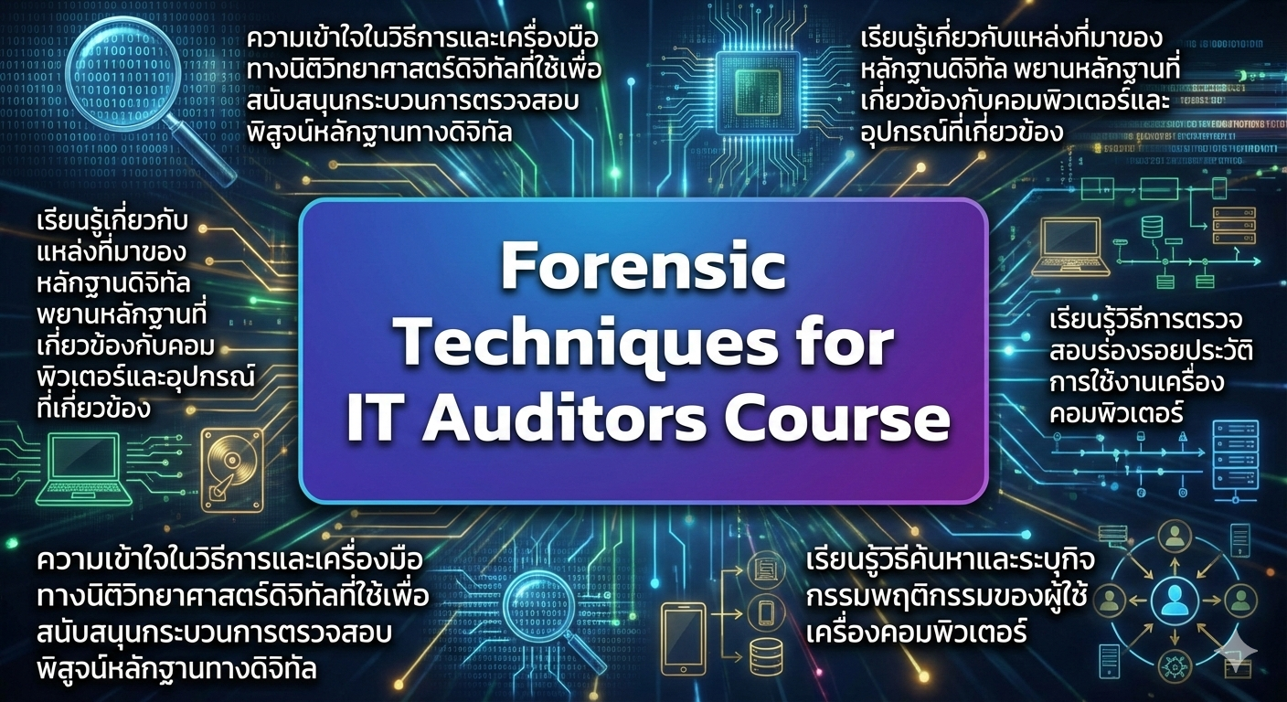 หลักสูตรฝึกอบรม 1 วัน สำหรับ IT Auditor ที่ต้องการเรียนรู้วิธีการใช้เทคนิคนิติวิทยาศาสตร์ (Digital Forensics) เพื่อเพิ่มกระบวนการตรวจสอบที่มีอยู่ หลักสูตรนี้เป็นหลักสูตรที่มีแบบฝึกหัดภาคปฏิบัติมากมาย เพื่อแสดงให้เห็นถึงเป้าหมายของการเรียนรู้